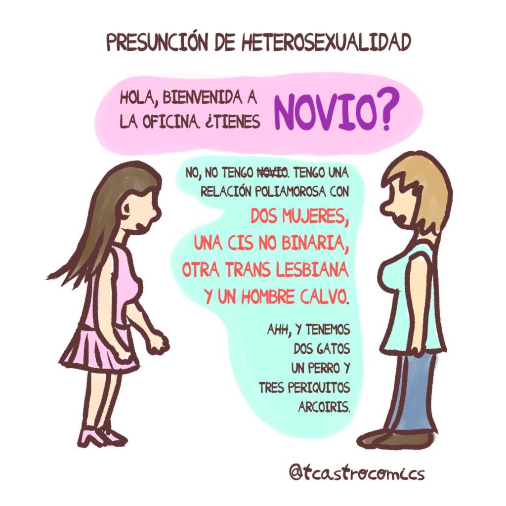A raíz de realizar un taller con Javi Royo, empecé a elaborar un proyecto personal en el que quería reflejar, mediante ilustraciones sencillas, las realidades y cuestiones que afectan al colectivo LGTBI+. Aquí muestro las primeras ilustraciones, pero sigo publicando más en mi cuenta de Instagram @tcastrocomics.