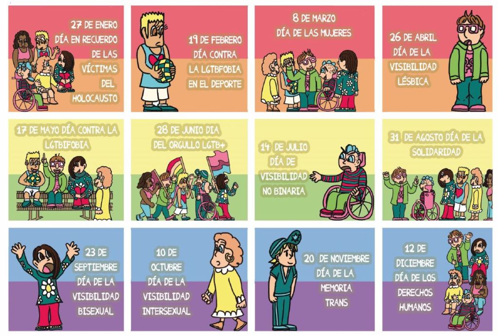 Proyecto de calendario con historietas de cómic que recorren los días del calendario importantes para la comunidad LGTBIQ+, realizado para Unesco Etxea. La cómics forman parte de este calendario y las ilustraciones se utilizaron también para la Guía didáctica. Derechos de la comunidad LGTBI+ mes a mes.